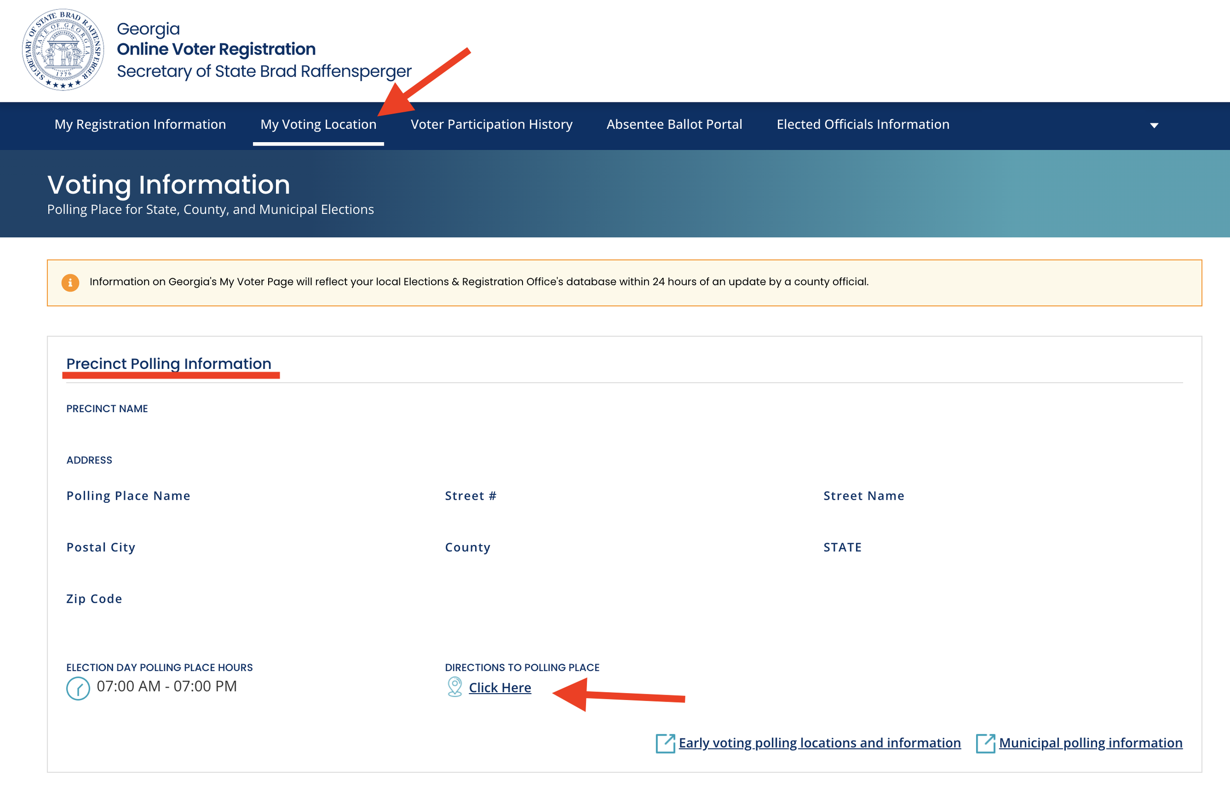 Debe asegurarse de ir a su recinto electoral/lugar de votación asignado. No se le permitirá votar si va a un lugar de votación equivocado. Puede verificar su lugar de votación en “My Voter Page”. Una vez que acceda a su perfil, haga clic en “My Voting Location” (“Indicaciones de mi lugar de votación”) en la parte superior de la página.